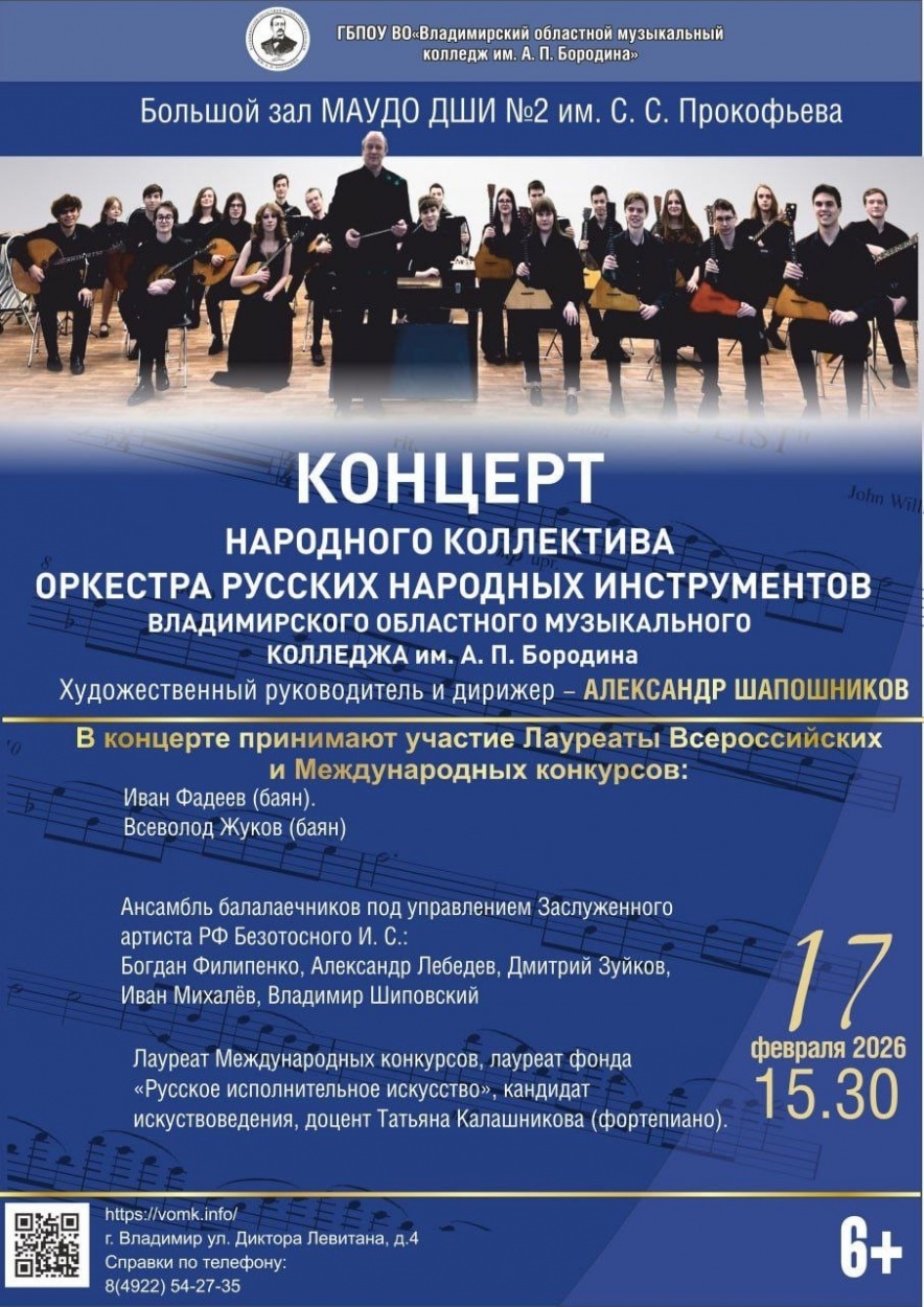 Приглашаем на концерт Народного коллектива Оркестра русских народных инструментов Владимирского областного музыкального колледжа им. А. П. Бородина 17 февраля в 15.30. Вход свободный.