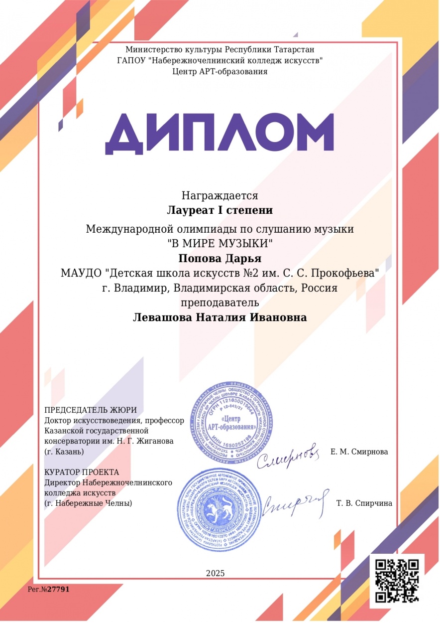 Поздравляем победителей Международной олимпиады по слушанию музыки "В мире музыки", которая проходила с 20.11 по 23.12 в г. Набережные Челны:
