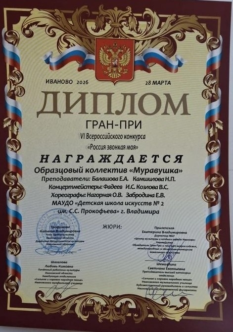 28 марта в городе Иваново прошел VI Всероссийский конкурс "Россия звонкая моя", на котором наш замечательный Образцовый коллектив хор русской песни "Муравушка" ( руководители: Балашова Елена Альбертовна и Камшилова Наталья Павловна) стал обладателем ГРАН-ПРИ. Но это не единственная победа этого конкурса. Волкова Александра (преподаватель Балашова Елена Альбертовна, концертмейстер Фадеев Иван Сергеевич) тоже стала обладателем ГРАН-ПРИ.